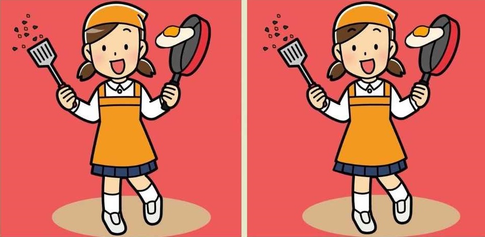 Na oboch kresbách je zobrazené dievča, ktoré pripravuje miešané vajíčka. A zdá sa, že má problém, pretože vyprážané vajíčko sa chystá z panvice spadnúť na zem.