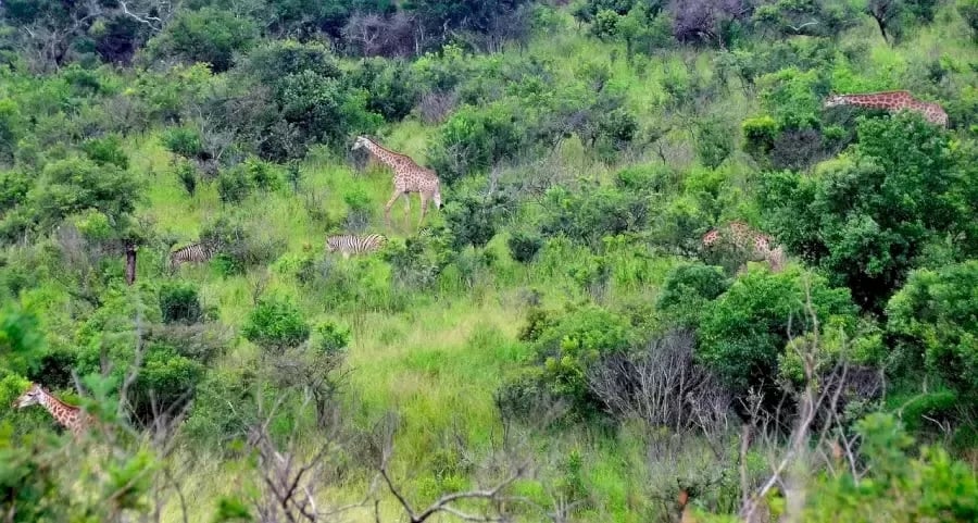 Vidíme skupinu zvierat, ktoré sa potulujú medzi zelenými stromami a kríkmi. Na obrázku je určitý počet žiráf a zebier. Spočítať ich presný počet však nie je jednoduchá úloha. Niektoré zvieratá sú totiž jasne viditeľné, ale zároveň niektoré z nich môžu byť našim očiam skryté.