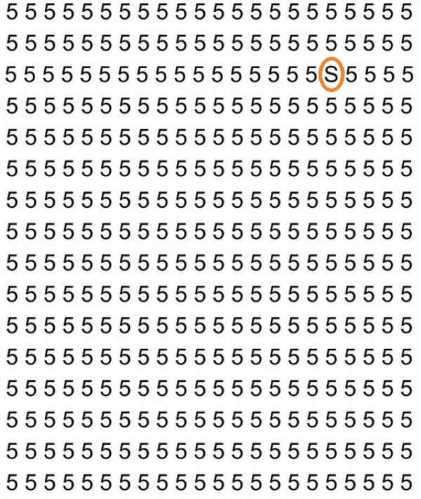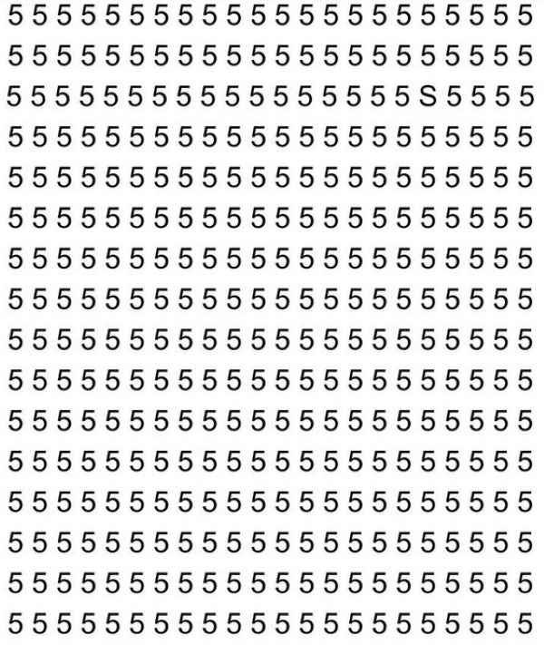 Na obrázku vidíme veľké množstvo číslic 5, ktoré sú usporiadané do riadkov a stĺpcov. Ak sa na tento obrázok pozriete, z prvých sekúnd sa vám môže zdať, že písmeno S určite nikde nie je. Tomuto prvému dojmu však netreba veriť – určite tam je, len nie je také ľahké si ho všimnúť.